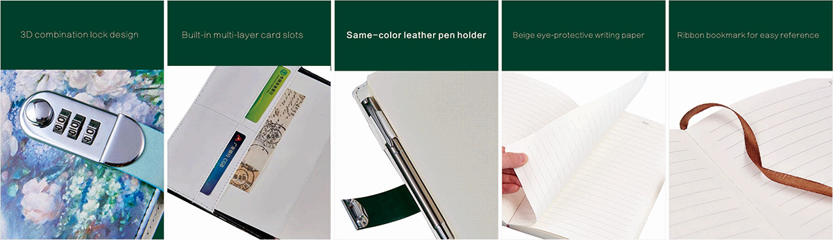 Tämän lukituspäiväkirjan kannen suunnittelu on näkyvä ominaisuus ja sillä on ainutlaatuinen taiteellinen viehätys. Tarjoamme erilaisia malleja, jotka kattavat erilaisia taiteellisia tyylejä. Nämä mallit eivät ole vain kauniita, vaan niillä on myös erinomainen kulutuskestävyys ja vedenpitävät ominaisuudet, jotka voivat paremmin suojata päiväkirjaa ja mukana sinua pitkään.
