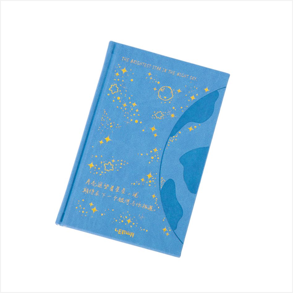 Tämän muistikirjan kannen malli on inspiroinut kirkkaan tähden taivaan. Sinisellä kansilla kultaiset tähdet, kuut ja planeetat on pistetty niiden välillä, ikään kuin koko yötaivas olisi tiivistynyt muistikirjaan. Jokainen tähti loistaa ainutlaatuisella valolla, ja jokainen planeetta herättää salaperäisen ilmapiirin, ikään kuin kertoisi maailmankaikkeuden loputtomat mysteerit.