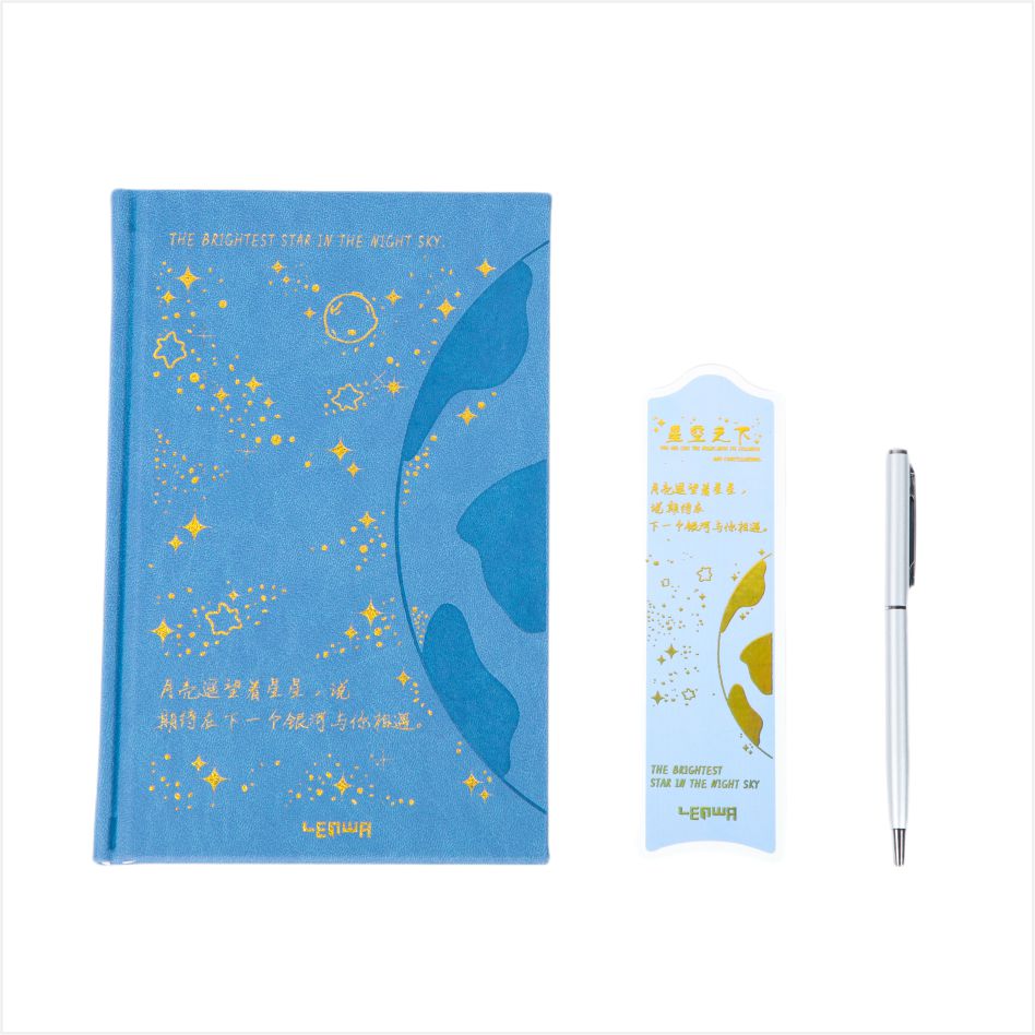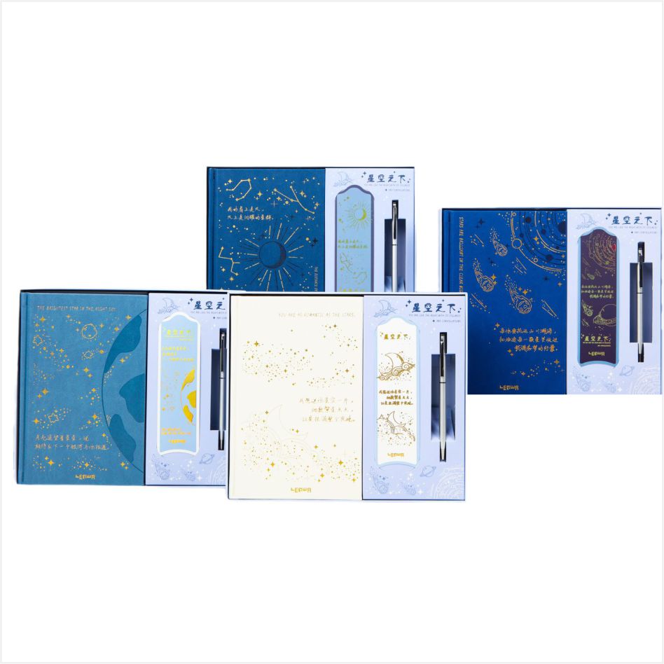 Hienon muistikirjan lisäksi muistikirjasarja sisältää myös hienon metallikynän ja vastaavan kirjanmerkin. Metallikynän suunnittelu on yksinkertainen, mutta tyylikäs, mukava pitää ja sileä kirjoittaa. Kirjanmerkki on tulostettu tähtitaivaan taivaan kuviolla, joka toistaa muistikirjan kannen, jotta voit tuntea tähtitaivaan viehätysvoiman luettaessa.